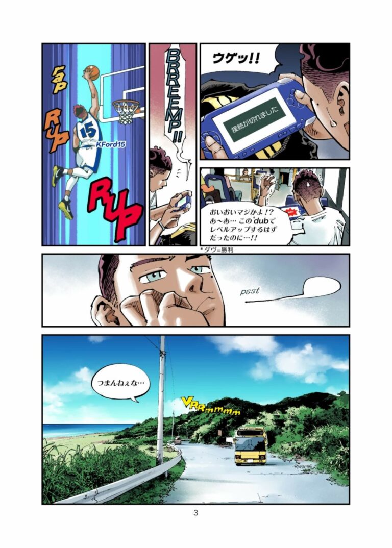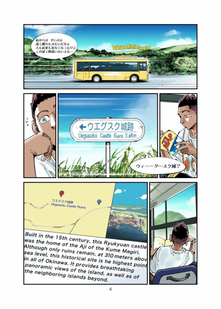 クメ島(沖縄県):ローカルバスに乗って黒川夫人の家に向かうキャム。彼は目の前に広がる緑豊かな丘を見つめながら新しい自転車を黒川夫人から受け取ることを楽しみにしているが、その一方で「こんな人里離れた田舎に本当に人が住んでいるのだろうか?」と不安になっていた。
